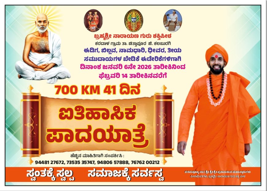 ಕಲಬುರಗಿಯ ಚಿತಾಪುರ ತಾಲೂಕು ಕರದಾಳು ಬ್ರಹ್ಮಶ್ರೀ ನಾರಾಯಣ ಗುರು ಶಕ್ತಿ ಪೀಠದಿಂದ ಬೆಂಗಳೂರಿನವರೆಗೆ ನಡೆಯುವ ಪಾದಯಾತ್ರೆಯ ಬಿತ್ತಿ ಚಿತ್ರವನ್ನು ಅಕ್ಟೋಬರ್ 19ರಂದು ಕಲಬುರಗಿಯಲ್ಲಿ ಬಿಡುಗಡೆ ಮಾಡಿ ಮಾತನಾಡಿದ ಅವರು ಪೂಜ್ಯ ಪ್ರಣವಾನಂದ ಶ್ರೀಗಳು ನಮ್ಮ ಸಮಾಜದ ಏಳಿಗೆಗಾಗಿ ಮತ್ತು ಭದ್ರತೆಗಾಗಿ ನಿರಂತರವಾಗಿ ಹೋರಾಟ ಮಾಡುತ್ತಿದ್ದು ಕಳೆದ ಬಾರಿ 780 ಕಿಲೋಮೀಟರ್ ಪಾದಯಾತ್ರೆಯನ್ನು ಮಂಗಳೂರಿನಿಂದ ಆರಂಭಿಸಿ ಫ್ರೀಡಂ ಪಾರ್ಕ್ ವರೆಗೆ ನಡೆಸಿದ ಪರಿಣಾಮವಾಗಿ ಈಡಿಗ ನಿಗಮವನ್ನು ಬಿಜೆಪಿ ಸರಕಾರ ಘೋಷಣೆ ಮಾಡಿತು ಮತ್ತು ಕುಲಶಾಸ್ತ್ರೀಯ ಅಧ್ಯಯನಕ್ಕೆ 25 ಕೋಟಿ ರೂಪಾಯಿ ಮಂಜೂರು ಮಾಡಿದ ಐತಿಹಾಸಿಕ ಯಶಸ್ವಿಯ ನಂತರ ಇದೀಗ ಎರಡನೇ ಬಾರಿಗೆ ಈ ಪಾದಯಾತ್ರೆಯನ್ನು ಕೈಗೊಂಡಿದ್ದಾರೆ. ಜನವರಿ 6 ರಂದು ಚಿತ್ತಾಪುರದ ಕರದಾಳುನಿಂದ ಆರಂಭಗೊಳ್ಳುವ ಪಾದಯಾತ್ರೆ ಚಿತ್ತಾಪುರ, ವಾಡಿ, ಶಹಬಾದ್ ಜೇವರ್ಗಿ ಶಹಾಪುರ, ಸುರಪುರ, ಲಿಂಗಸಗೂರು ತಾವರಗೇರಾ, ಗಂಗಾವತಿ, ಹೊಸಪೇಟೆ ಚಿತ್ರದುರ್ಗ,ತುಮಕೂರು, ಮಾರ್ಗವಾಗಿ ಬೆಂಗಳೂರಿನ ಫ್ರೀಡಂ ಪಾರ್ಕಿಗೆ ತಲುಪಲಿದೆ. ಈ ಸಂದರ್ಭದಲ್ಲಿ ಸಮುದಾಯದ ಎಲ್ಲರೂ ಸ್ವಾಮೀಜಿಯವರಿಗೆ ಪೂರ್ಣ ಪ್ರಮಾಣದ ಬೆಂಬಲವನ್ನು ನೀಡಲು ಸಜ್ಜಾಗೋಣ. ಈಡಿಗ ಬಿಲ್ಲವ ಸೇರಿದಂತೆ 26 ಪಂಗಡಗಳಿಗೆ ಸಿಗಬೇಕಾದ ಸವಲತ್ತುಗಳನ್ನು ಪಡೆಯಲು ಸರಕಾರದ ಕಣ್ಣು ತೆರೆಸುವುದಕ್ಕಾಗಿ ಹೋರಾಟದ ಅಂಗವಾಗಿ ಪಾದಯಾತ್ರೆಯನ್ನು ಯಶಸ್ವಿಗೊಳಿಸುವುದು ನಮ್ಮೆಲ್ಲರ ಕರ್ತವ್ಯ ಎಂದು ಹೇಳಿದರು.