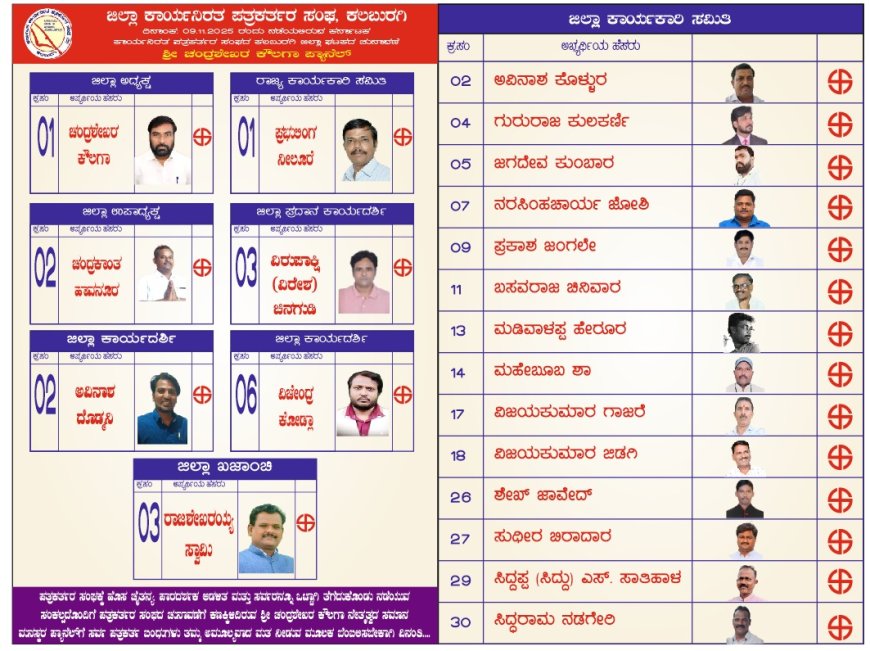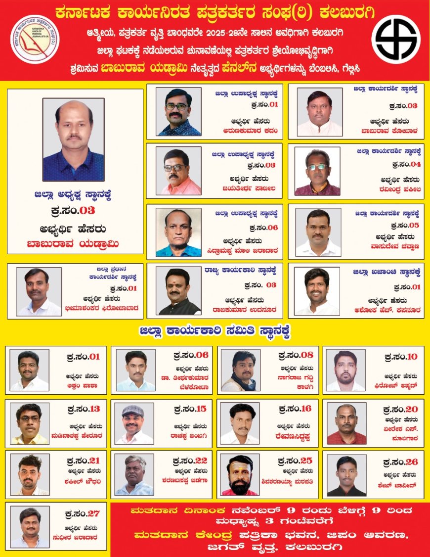 ಕಲಬುರ್ಗಿ ಜಿಲ್ಲೆಯಲ್ಲಿ ಕರ್ನಾಟಕ ಕಾರ್ಯನಿರತ ಪತ್ರಕರ್ತರ ಸಂಘದ ನೊಂದಾಯಿತ ಸದಸ್ಯರ ಸಂಖ್ಯೆ ೪೧೬ ಮತಗಳಿವೆ, ಜಿಲ್ಲಾ ಅಧ್ಯಕ್ಷ ಸ್ಥಾನಕ್ಕೆ ನಾಲ್ಕು ಜನ ಅಭ್ಯರ್ಥಿಗಳು ಸ್ಪರ್ಧಿಸಿದ್ದಾರೆ, ಈ ನಾಲ್ವರ ಮಧ್ಯೆ ತುರುಸಿನ ಪೈಪೋಟಿ ಏರ್ಪಟ್ಟಿದೆ. ಬಾಬುರಾವ್ ಯಡ್ರಾಮಿ ಅವರು ಈ ಹಿಂದೆ ಮೂರು ಬಾರಿ ಆಯ್ಕೆಯಾಗಿದ್ದು, ನಾಲ್ಕನೇ ಬಾರಿ ತಮ್ಮ ಅದೃಷ್ಟ ಪರೀಕ್ಷೆಗೆ ಇಳಿದಿದ್ದಾರೆ .ಇವರ ಅಧಿಕಾರದ ಅವಧಿಯಲ್ಲಿ ಸಂಘದ ಏಳಿಗೆಗಾಗಿ ಇವರು ಸಾಕಷ್ಟು ಶ್ರಮವಹಿಸಿದ್ದು, ಪತ್ರಿಕಾ ಭವನ ಹಾಗೂ ಪತ್ರಕರ್ತರಿಗೆ ಸುಸಜ್ಜಿತ ಕಛೇರಿ ಮತ್ತು ಭವನವನ್ನು ನವಿಕರಣಗೊಳಿಸಿದ್ದಾರೆ. ಸಂಘದಲ್ಲಿ ತಕ್ಕ ಮಟ್ಟಿಗೆ ಹಣ ಇಡಗಂಟು ಕೂಡ ಇಟ್ಟಿದ್ದಾರೆಂದು ತಿಳಿದು ಬಂದಿದೆ.