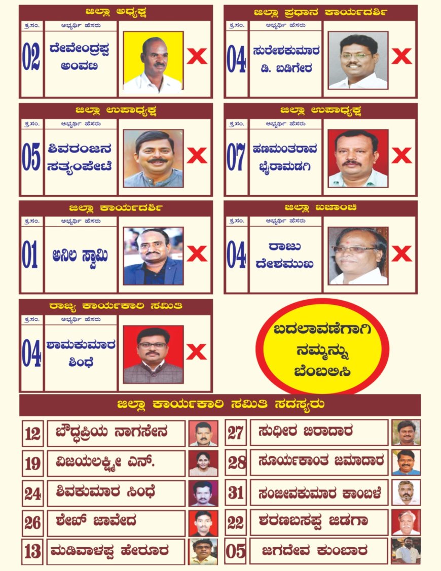 ಜಿಲ್ಲಾಧ್ಯಕ್ಷ ಸ್ಥಾನಕ್ಕೆ ೪ ಜನ ಸೇರಿ ಒಟ್ಟು ೬೦ ಸ್ಪರ್ಧಿಗಳು ಕಣದಲ್ಲಿದ್ದಾರೆ. ಒಬ್ಬ ಮತದಾರ ೨೫ ಮತ ಚಲಾಯಿಸಬಹುದಾಗಿದೆ.