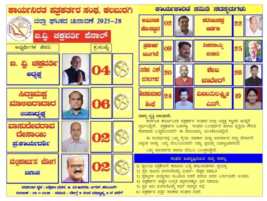 ಕಲಬುರಗಿ : ಕರ್ನಾಟಕ ಕಾರ್ಯನಿರತ ಪತ್ರಕರ್ತರ ಸಂಘದ ಚುನಾವಣೆಯು ಇದೇ ನವಂಬರ್ 9 ರ ಬೆಳಿಗ್ಗೆ ೯ ಗಂಟೆಯಿಂದ ಮಧ್ಯಾಹ್ನ ೩ ಗಂಟೆ ವರೆಗೆ ಮತದಾನ ನಡೆಯಲಿದ್ದು, ಆನಂತರ ಚುನಾವಣಾ ಎಣಿಕೆ ಪ್ರಕ್ರಿಯೆ ನಡೆಯಲಿದೆ. ಅಂದೆ ಫಲಿತಾಂಶ ಪ್ರಕಟಗೊಳ್ಳಲಿದೆ.