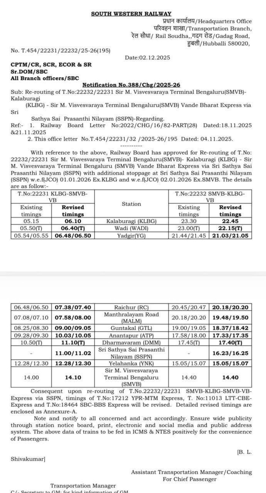 ಬಹುದಿನಗಳಿಂದ ಕಲಬುರಗಿಯಿಂದ ಬೆಂಗಳೂರಿಗೆ ಹೊರಡುವ ವಂದೇ ಭಾರತ್ ರೈಲಿನ ಸಮಯ ಬದಲಾವಣೆ ಮಾಡುವಂತೆ ಕೋರಿ ಪ್ರಯಾಣಿಕರು ಒತ್ತಾಯಿಸುತ್ತಿದ್ದು ರೈಲ್ವೆ ಇಲಾಖೆಯವರೊಂದಿಗೆ ಸತತವಾಗಿ ಚರ್ಚಿಸಿದ ಪರಿಣಾಮವಾಗಿ ಮುಂದಿನ ತಿಂಗಳು ಜನವರಿ 1 ರಿಂದ ಬೆಳಿಗ್ಗೆ 5.15 ರ ಬದಲು ಬೆಳಗ್ಗೆ 06:10 ಕ್ಕೆ ಹೊರಟು ಬೆಂಗಳೂರಿಗೆ ಮಧ್ಯಾಹ್ನ 02:10 ಕ್ಕೆ (ಸರ್ ಎಂ. ವಿಶ್ವೇಶ್ವರಯ್ಯ ಟರ್ಮಿನಲ್ ಬೈಯಪ್ಪನಹಳ್ಳಿ) ತಲುಪಲಿದೆ ಎಂದು ಡಾ. ಉಮೇಶ್ ಜಾಧವ್ ತಿಳಿಸಿದ್ದಾರೆ