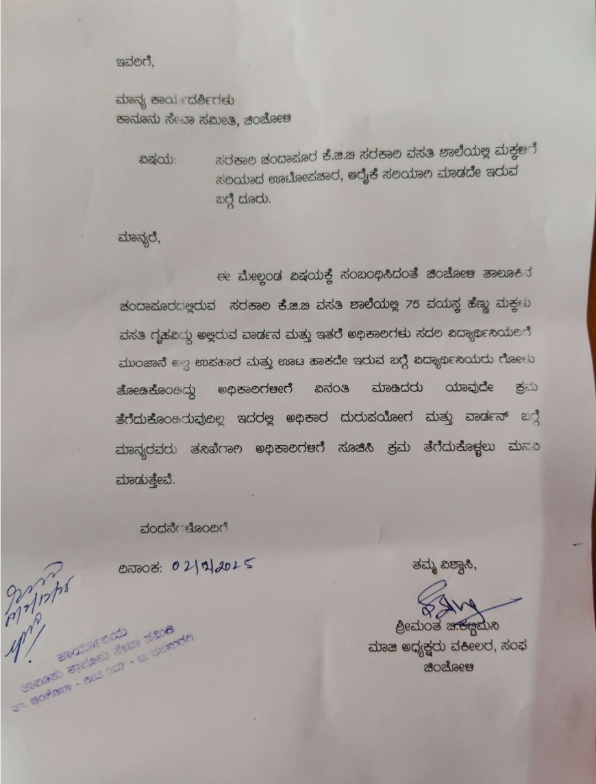 ಪ್ರಕಟಣೆ ನೀಡಿರುವ ಅವರು, ನಿಲಯ ಮೇಲ್ವಿಚಾರಿಕಿ ಹಾಗೂ ಸಂಬಂಧಪಟ್ಟ ಅಕ್ಷರ ದಾಸೋಹ ಸಹಾಯಕ ನಿರ್ದೇಶಕ ಮತ್ತು ಸಾರ್ವಜನಿಕ ಶಿಕ್ಷಣ ಇಲಾಖೆಯ ಕ್ಷೇತ್ರ ಶಿಕ್ಷಣಾಧಿಕಾರಿಗಳು ಮಕ್ಕಳಿಗೆ ಊಟ, ಉಪಹಾರದ ಜೊತೆಗೆ ಸೋಲಭ್ಯಗಳು ನೀಡಲು ಸರಕಾರ ರೂಪಿಸಿರುವ ನಿಯಮಗಳಂತೆ ಒದಗಿಸುವಲ್ಲಿ ಅಧಿಕಾರಿಗಳು ಅಧಿಕಾರ ದುರುಪಯೋ ಪಡಿಸಿಕೊಳ್ಳಲಾಗಿದ್ದು, ಅವರನ್ನು ಸೇವಾಯಿಂದ ಅಮಾನತುಗೊಳಿಸಿ, ಅಧಿಕಾರಿಗಳ ತಂಡದಿಂದ ತನಿಖೆ ನಡೆಸಬೇಕೆಂದು ಸಮಿತಿಗೆ ದೂರು ನೀಡಲಾಗಿದೆ. ಗ್ರಾಮೀಣ ಭಾಗದಿಂದ ಶೈಕ್ಷಣಿಕ ವಿದ್ಯಾಭ್ಯಾಸಕ್ಕಾಗಿ ಕುಟುಂಬದ ಪೋಷಕರನ್ನು ತೊರೆದು ನಿಲಯಕ್ಕೆ ಆಗಮಿಸಿ, ನೆಲೆಸಿರುವ ಒಟ್ಟು 75 ವಿದ್ಯಾರ್ಥಿನಿಯರಿಗೆ ಸಮಯಕ್ಕೆ ಸರಿಯಾಗಿ ಉಪಹಾರ ಮತ್ತು ಆರೈಕೆಗೆ ಒತ್ತು ನೀಡದೇ ಅಧಿಕಾರಿಗಳು ಹಾಗೆಯೇ ಶಾಲಾ ತರಗತಿಗಳಿಗೆ ಕಳುಹಿಸಲಾಗುತ್ತಿದೆ. ಮಕ್ಕಳು ಶಾಲೆಯ ಬಿಸಿ ಊಟದ ಮೇಲೆ ಅವಲಂಬಿತರಾಗಿದ್ದೇವೆಂದು ದೂರಿರುವ ಹಿನ್ನಲೆಯಲ್ಲಿ ಅಧಿಕಾರಿಗಳಿಗೆ ಅಮಾನತುಗೊಳಿಸಿ ತನಿಖೆ ಕೈಗೊಂಡು ಕ್ರಮ ಜರುಗಿಸಬೇಕೆಂದು ಕಾನೂನು ಸೇವಾ ಸಮಿತಿಗೆ ದೂರು ಸಲ್ಲಿಸಲಾಗಿದೆ ಎಂದು ವಕೀಲ ಕಟ್ಟಿಮನಿ ತಿಳಿಸಿದ್ದಾರೆ.
